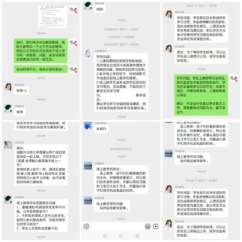会议第二项:七年级语文组教师依次就自己在线上教学过程中遇到的问题、困难,以及进行线上教学时摸索出来的有效做法及经验进行交流、讨论。为了便于大家借鉴学习,我们又以文字的形式发在群里共享。
