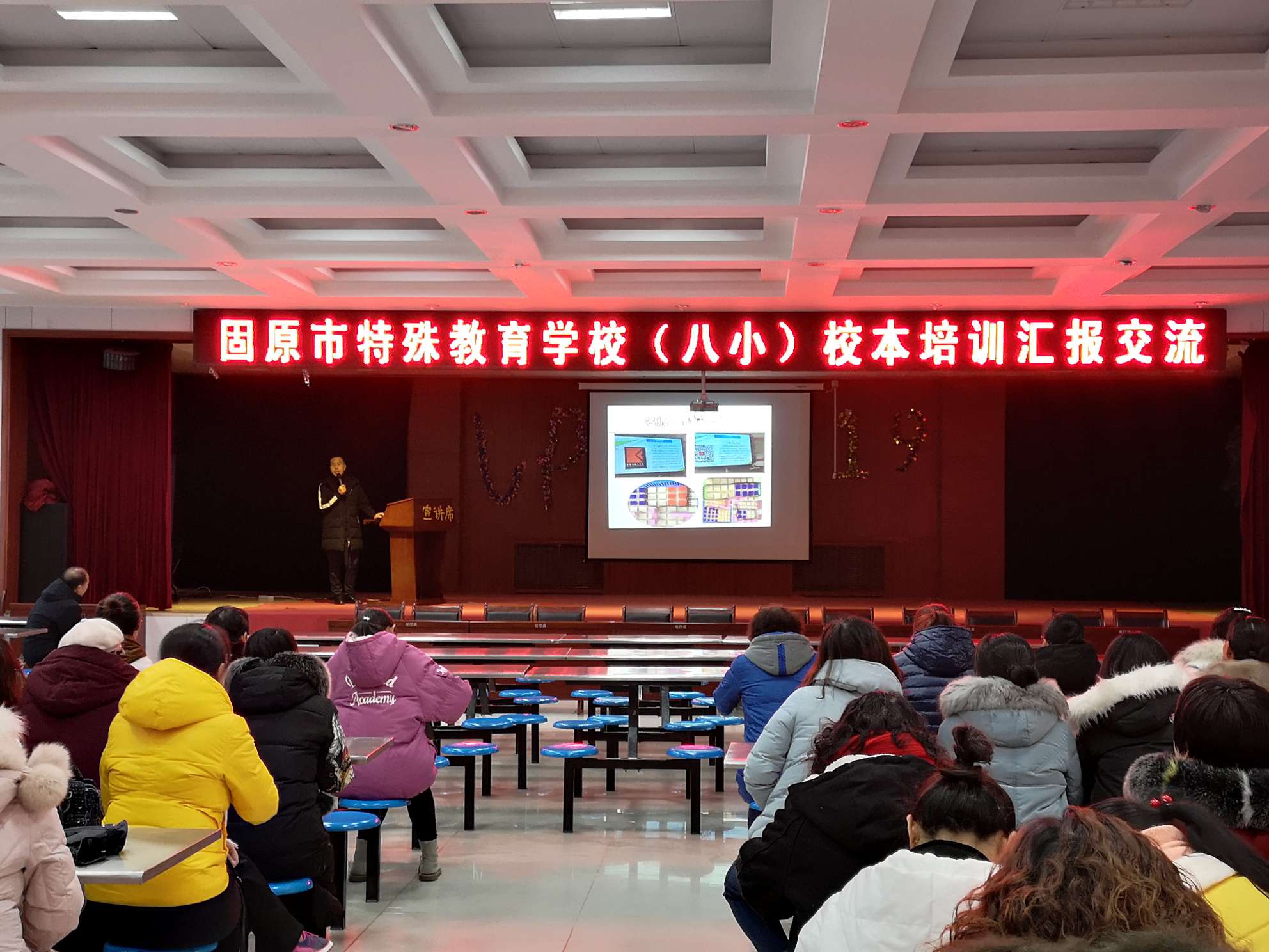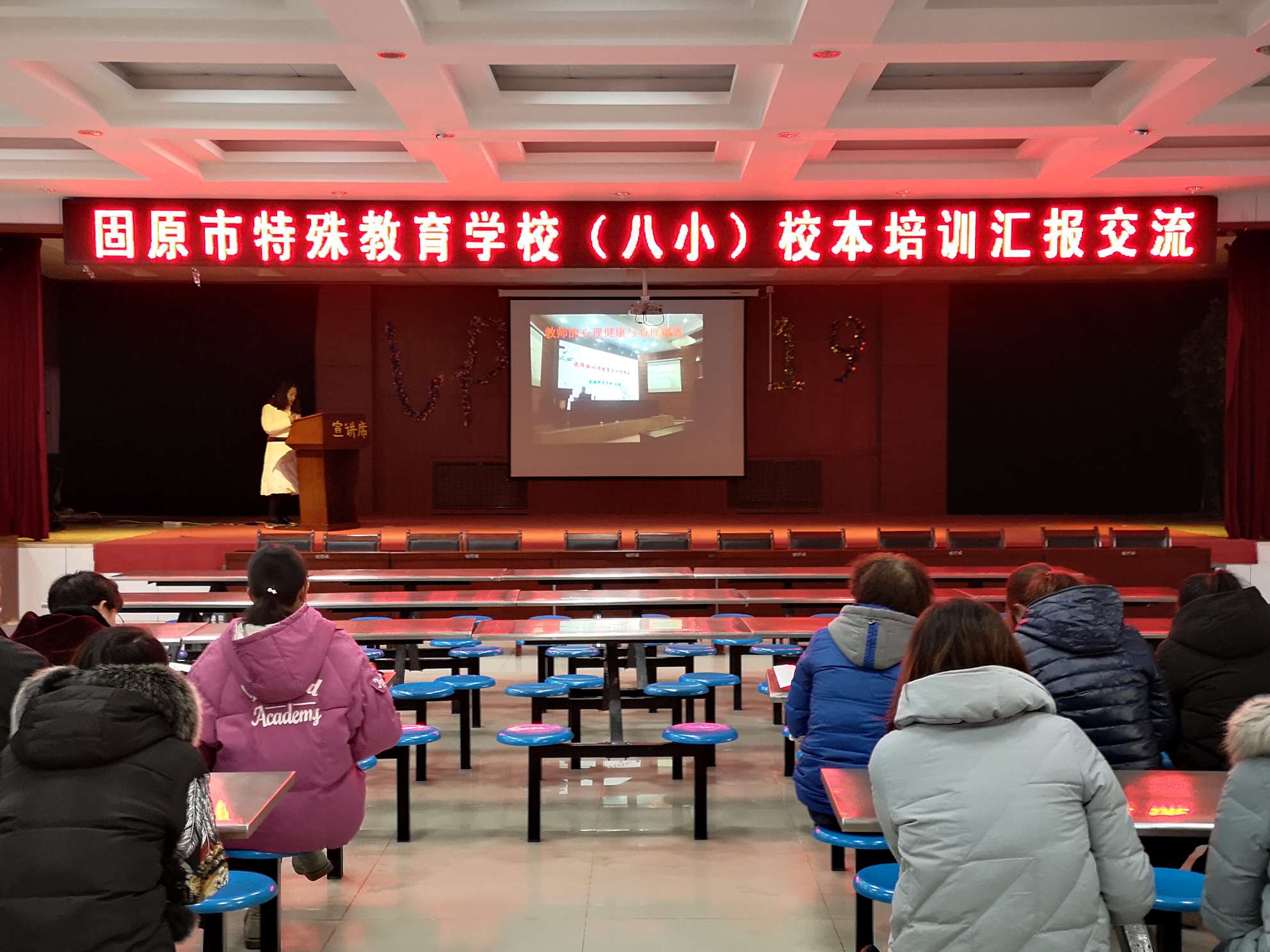 2019年12月17日,在整体校本培训会上,教科室李主任和普语组李霞老师分别以专题讲座的形式给大家分享了自己外出参加“六盘名师”和“班主任心理健康教育及家长工作种子团队研修”心得体会与收获。
