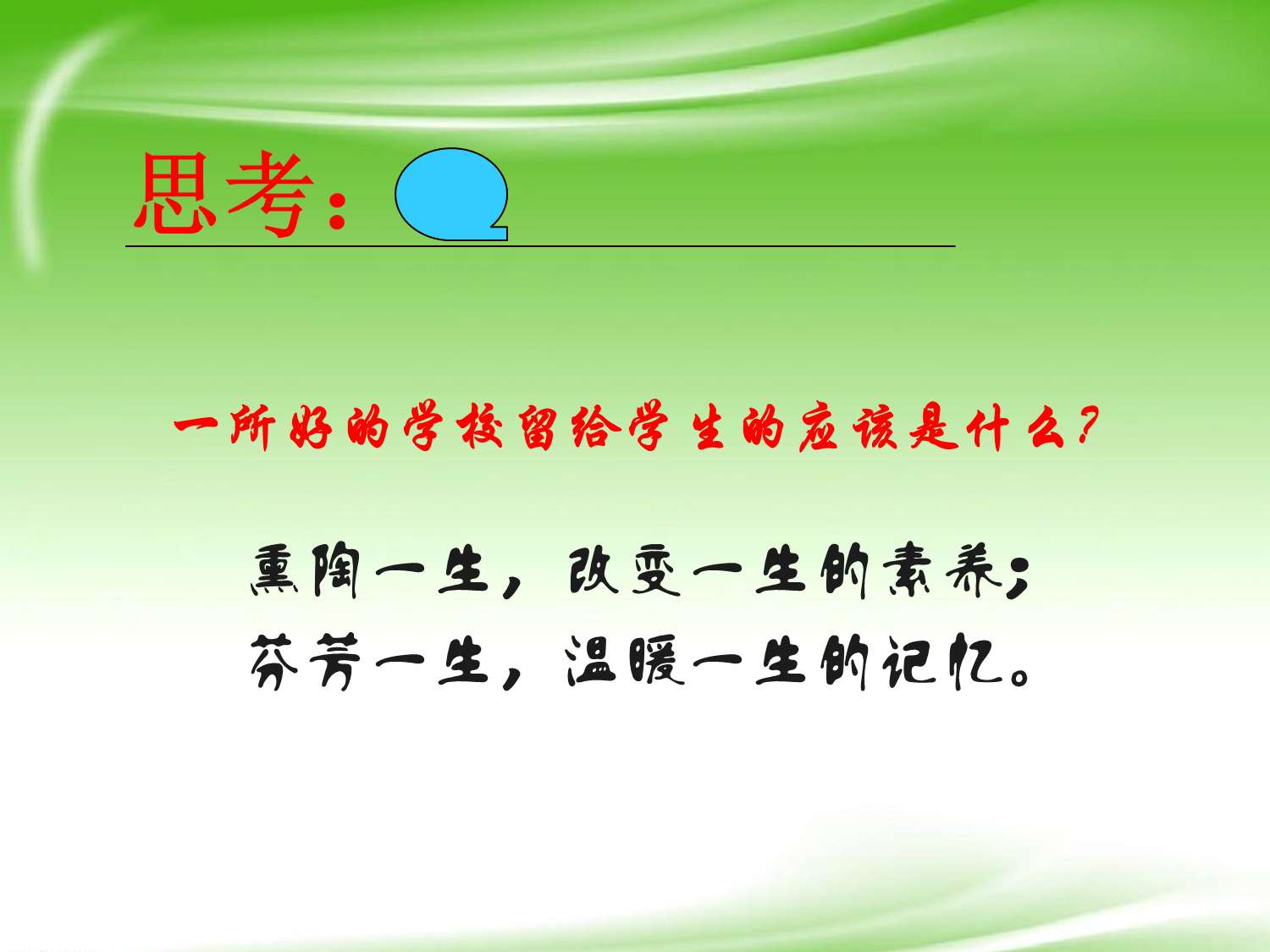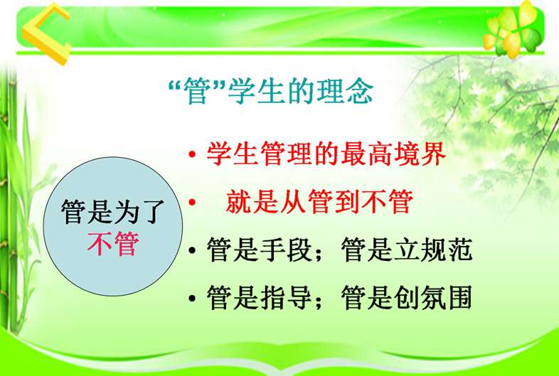 用服务的态度“管”学生。让每一个学生因我们的服务而获得最大程度的发展。教育者也要致力于为学生和家长提供高品质的教育产品,让人尊重,让人追随。