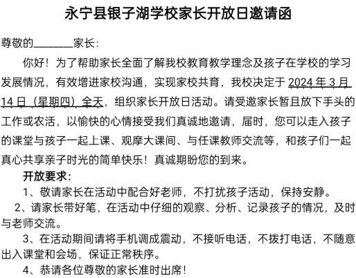 本次“家长开放日”活动加强了家校沟通,促进了学校教育教学工作的改进。学校将认真梳理家长们提出的意见和建议,不断改进教育教学工作,提高教育质量。再次感谢各位家长对学校工作的支持和关心,让我们携手共进,为孩子们的美好未来共同努力!